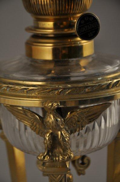 LAMPE À HUILE "MATADOR 15" en bronze et cristal taillé, en forme de réchaud à l'athénienne reposant sur trois colonnes surmontées d'un aigle aux ailes déployées réunies par un cul de lampe en chute et reposant sur un socle triangulaire orné d'une double frises perlée et de feuilles d'eau entourant un pomme de pin. Bouton et réservoir de laiton marqué "*** / MATADOR / 15''' ".