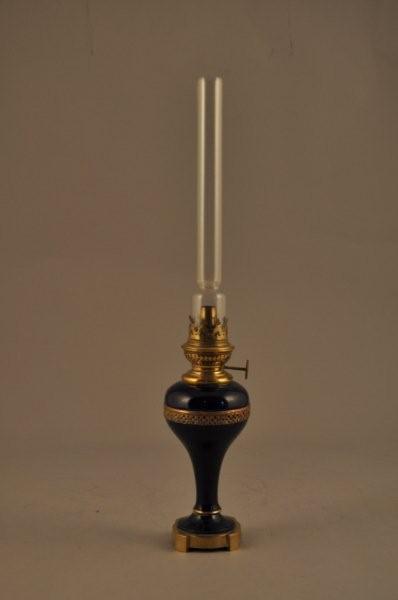 Petite LAMPE À HUILE "KOSMOS" en porcelaine bleue nuit de forme toupie pour le réservoir et fine monture de bronze ajouré. Bouton marqué "BRENNER * KOSMOS".