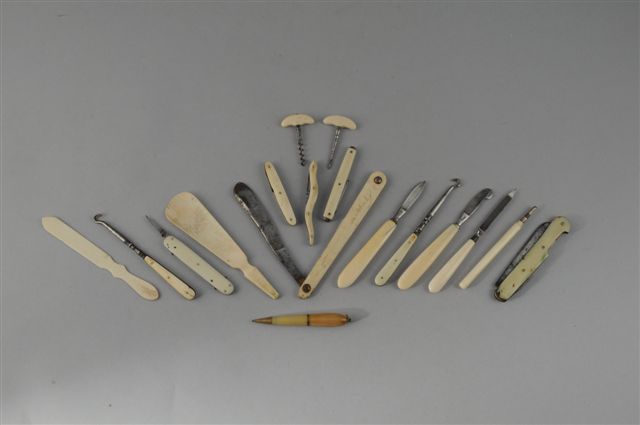 Ensemble d'ACCESSOIRES de TOILETTE en ivoire et os comprenant 16 pièces: croche-bottines, ustensils de manucure, coupe-choux, petits couteaux...