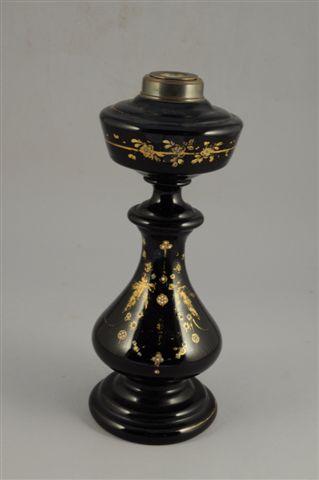 LAMPE à pétrole sur piédouche en verre opalin noir, la base piriforme, la partie supérieure formant réservoir à décor doré et émaillé de motifs floraux stylisés. Haut. 40 cm. Fin XIXème. (transformé à l'électricité, usures au décor)