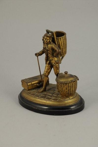 ENCRIER Gentilhome voyageur en régule à patine dorée. La terrasse ovale en bois noirci, présente un voyageur en pied à sa canne, portant une hotte. Sur une base à l'imitation des pavés sont posés une malle en osier formant réceptacle à encre, et une valise formant range-plumes.