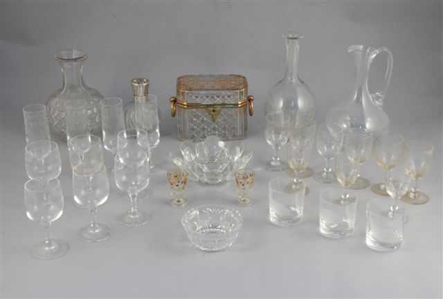 LOT comprenant un COFFRET en verre taillé à anses latérales "anneau" en laiton, deux CARAFES et un rammequin en verre moulé, une LAMPE BERGER à réservoir moulé en verre incolore à côtes torses, un DESSOUS de CARAFE (?) appliqué de pendeloques facettées disposées en fleur, deux VERRES à liqueur sur pied en verre émaillé à pastillage appliqué à chaud, deux parties de SERVICE de VERRES 19 pièces, un BROC et verres divers.