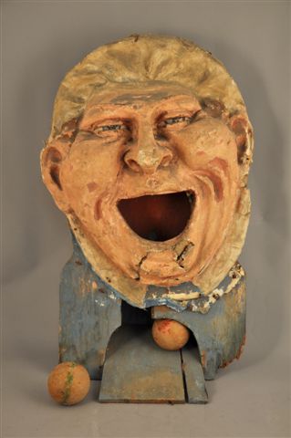JEU de FOIRE représentant une figure d'homme riant, la bouche grande ouverte, pour lancer de boule. Papier mâché et bois peint. Avec deux boules en bois.