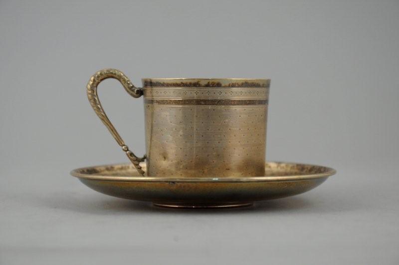 TASSE et sa SOUS-TASSE en argent. La tasse de forme calabre à décor guilloché de rayures à semis de pois, anse feuillagée, cartouche ovale feuillagé chiffré. Poinçon Minerve.