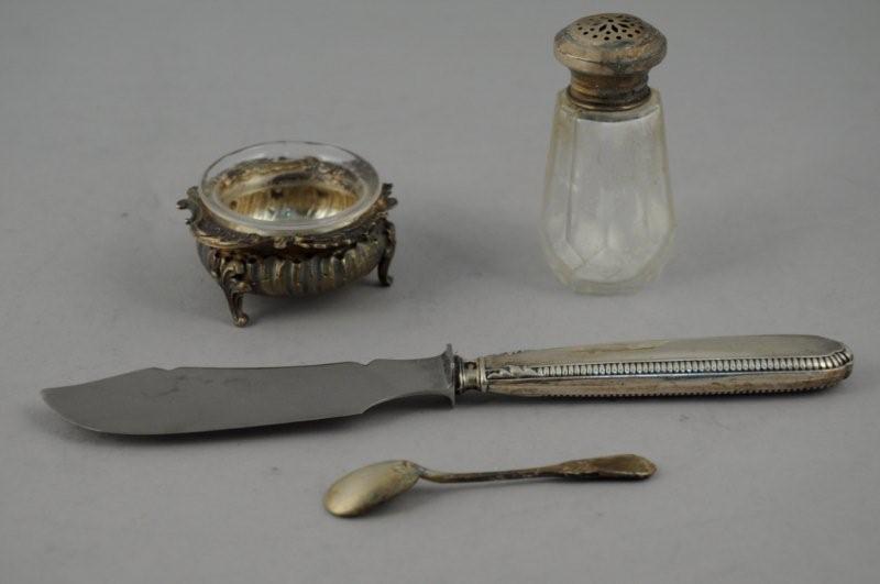 SALIÈRE en verre moulé, le bouchon en argent. Poinçon Minerve. Haut. (chocs, égrenure à la base), COUTEAU à fromage à manche en argent fourré orné d'une frise godronnée