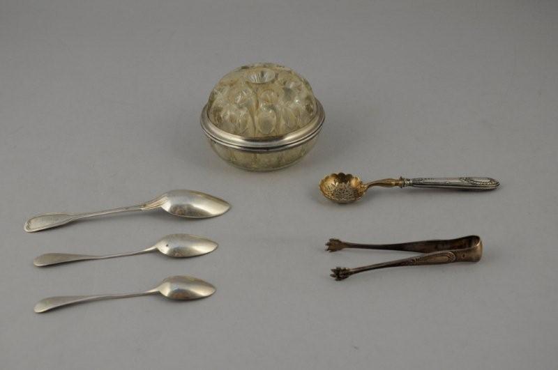 LOT en argent comprenant DEUX CUILLÈRES à café, modèle baguette, une CUILLÈRE de couvert d'enfant, modèle à filets, XIXème, une PINCE à SUCRE en argent et une SAUPOUDREUSE de style Louis XVI en argent fourré, un PIQUE FLEURS en verre moulé monté argent. Poinçon Minerve. Poids des pièces pesables: 95 g.