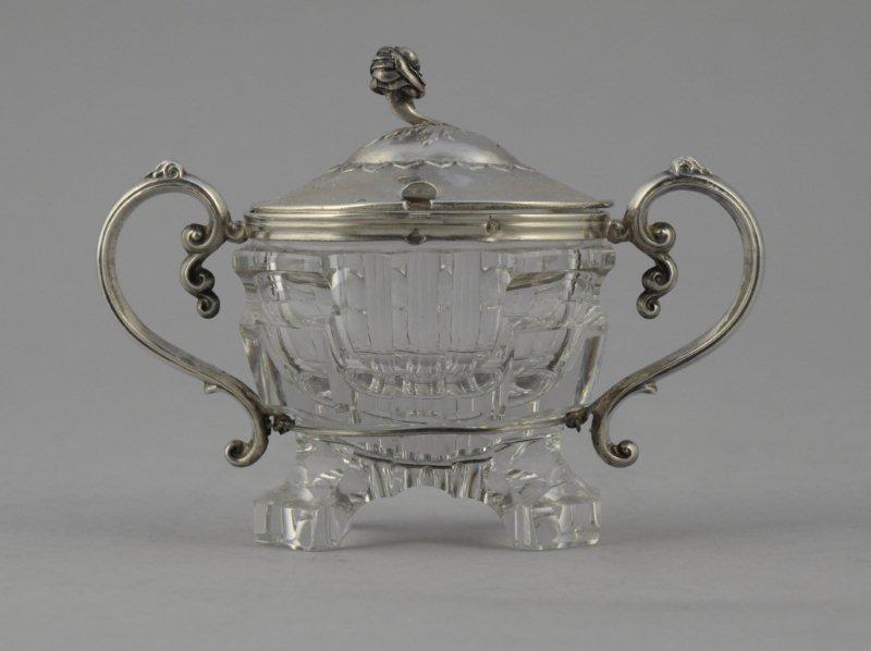 MOUTARDIER ovale en cristal taillé à monture en argent. Il repose sur quatre pieds. La monture composée de deux anses latérales en enroulement et d'un couvercle à charnièreà prise en fleur épanouie. Poinçon Minerve. XIXème. Poids brut: 355 g.