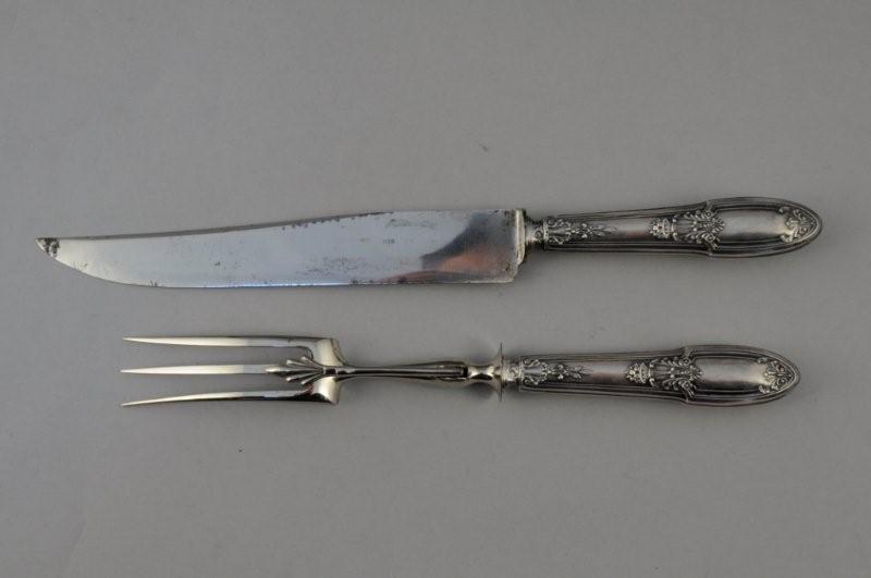 SERVICE à GIGOT à manches en argent fourré à motifs de vases fleuris et feuilles stylisées. Poinçon Minerve. Dans un écrin. Style Louis XVI. Fin XIX-début XXème. Poids brut: 225 g.