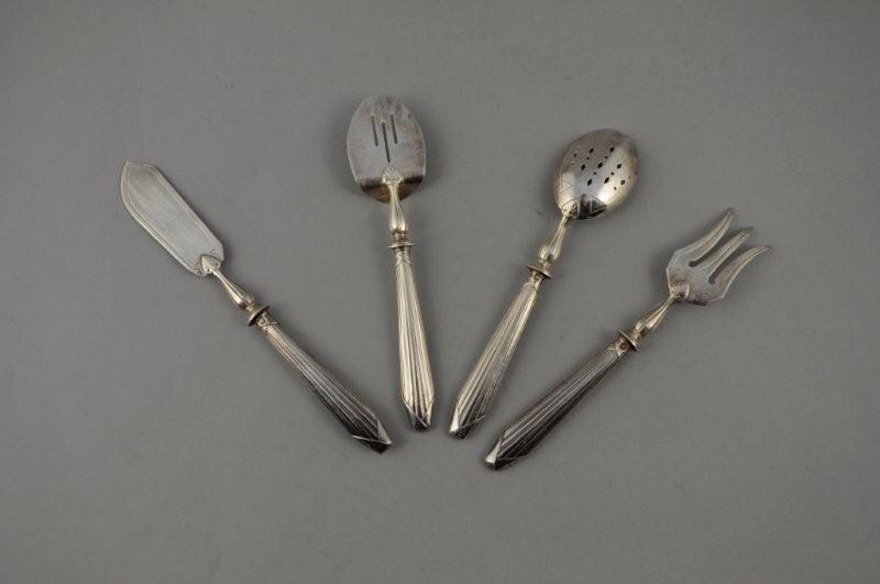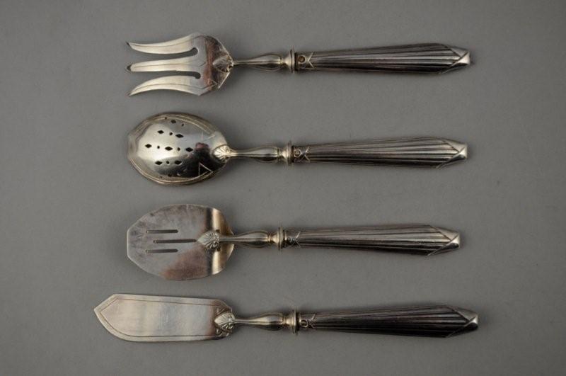 SERVICE à HORS D'OEUVRE quatre pièces à manches en argent fourré à motif rayonnant. Fourcheton et cuillerons en métal argenté. Poinçon Minerve. Dans un écrin. Art Déco. Poids brut: 125 g.