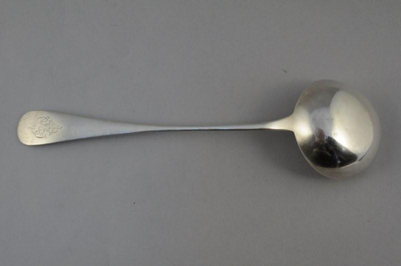 LOUCHE en argent, modèle baguette ou Vieux Paris. Monogrammée "L.A.". Poinçon Minerve. Poids: 170 g. (petit choc)