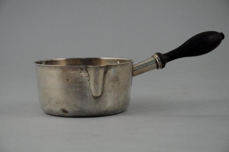 CASSEROLE en argent uni, le bec verseur pris sur pièce, le manche en bois tourné noirci. Poinçon Minerve. XIXème. Poids brut: 210 g. (petits chocs)