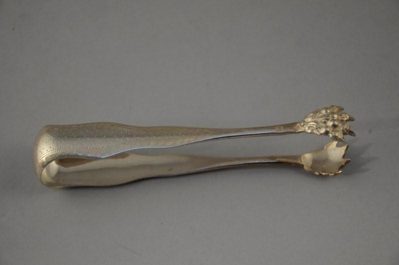 PINCE à SUCRE en argent à décor gravé d'un semis de pois, cartouche feuillagé (non monogrammé), prises en griffes. Fin XIXème. Poids: 45g