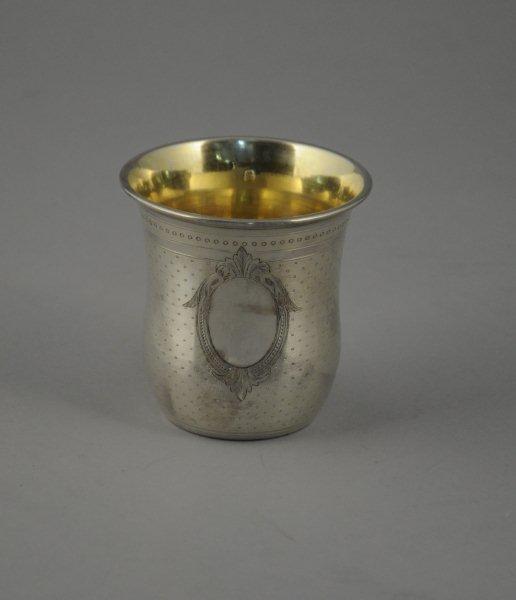 TIMBALE légèrement évasée en argent, à décor amati de perles, large cartouche feuillagé. Intérieur vermeil. Napoléon III, fin XIXème. Poinçon Minerve. Maître Orfèvre au lapin. Haut. 8,5 cm. Poids: 87 gr.