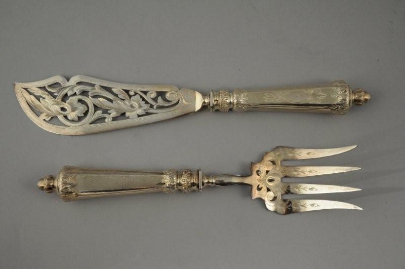 SERVICE À POISSON: pelle et fourchette 4 dents à servir. Manche en argent fourré. De style début XVIIIème. Acanthes, godrons et feuillage. Fin XIXème.