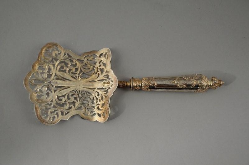 PELLE À ASPERGES. Manche en argent fourré. Pelle richement ajourée de rinceaux et de trois asperges. De style Rocaille, fin XIXème.