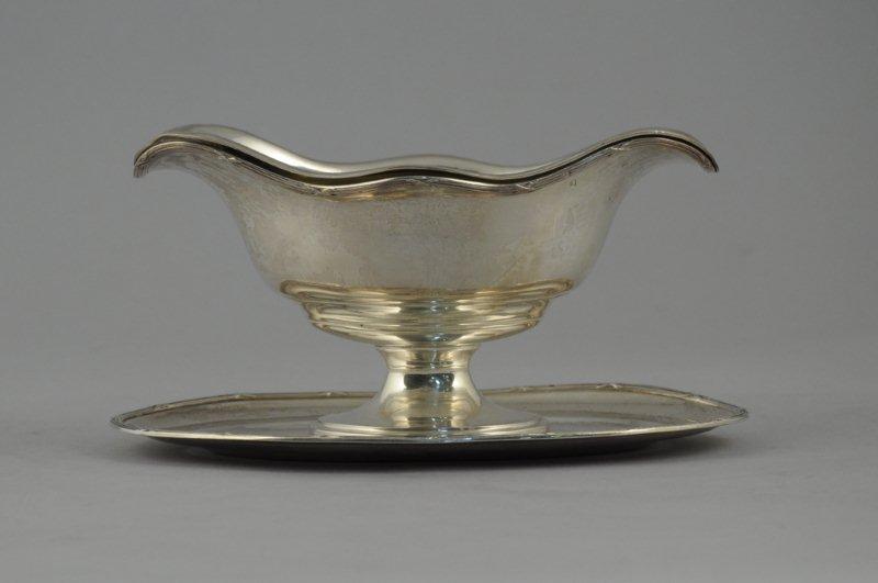SAUCIERE sur son PLATEAU en argent de style Louis XVI. Forme ovale à tores de laurier. Réceptacle en métal argenté. Armoirie couronne comtale encadrée de deux lions. Poinçon Minerve. Long. 23, Haut. 11 cm. Poids argent 586 gr.