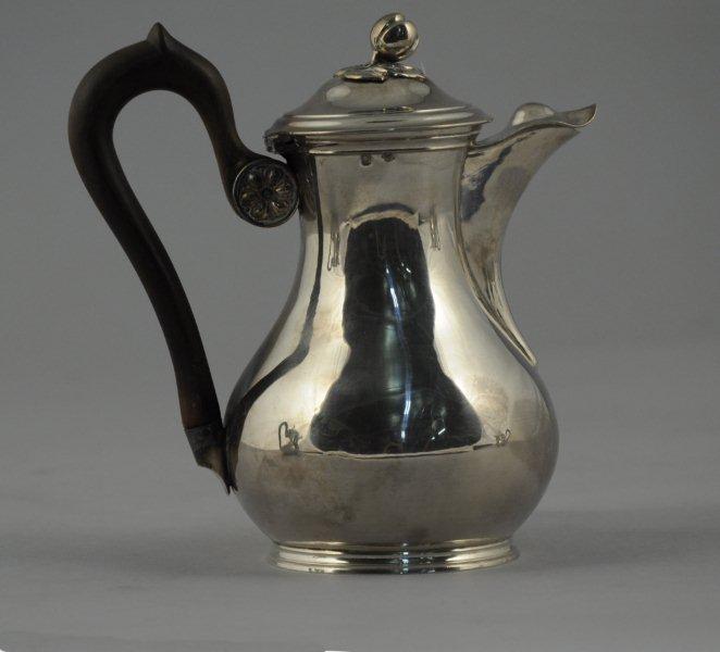 VERSEUSE à fond plat sur léger piédouche en argent. Fretel de tomate, bec verseur en canard. Manche bois tourné. XIXème. Poinçon Minerve. Haut. 15,5 cm.. Poids brut: 222 gr.