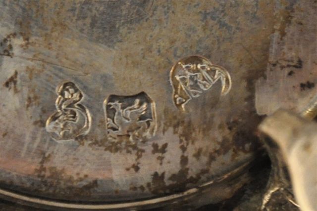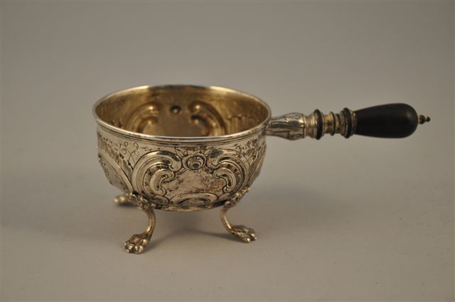 CASSEROLE en argent, repose sur quatre pieds griffes sommés de fleurons, le corps à décors de coquilles et de rinceaux fleuris, le manche en bois tourné noirci. La Rochelle. Fin XVIIIème. Haut. 5,5 cm. Poids: 95 g.
