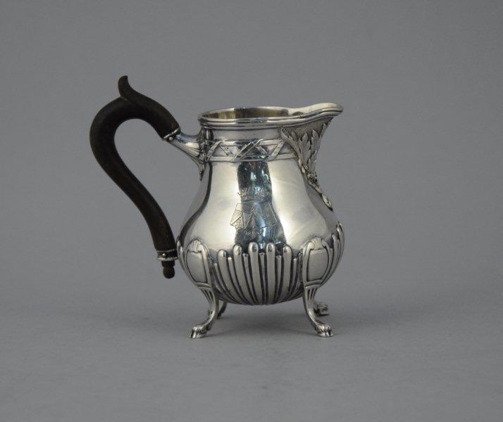 POT à LAIT en argent. Il repose sur quatre pieds terminés en sabot de cervidé. La base à godrons rayonnants et le col à décor en repoussé de rubans. Bec verseur orné de feuilles d'acanthe et d'une guirlande de roses. Anse galbée en bois naturel. Orfèvre: HARLEUX. Poinçon Minerve.