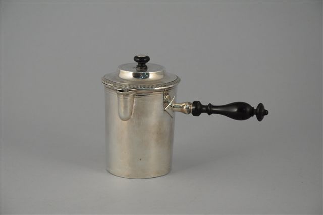 LAITIÈRE en argent uni de forme cylindrique, à fond plat, à bec verseur pris sur pièce, filets au col. Couvercle à profil concave, orné d'une frise feuilles d'eau en bordure. Prise du couvercle et manche latéral en bois tourné noirci. Poinçon Vieillard (1819-1838). Orfèvre: Antoine MORANGE. Poids brut: 210 g. Haut. 12,5 cm (infime fente au col)