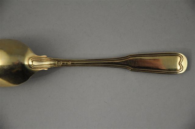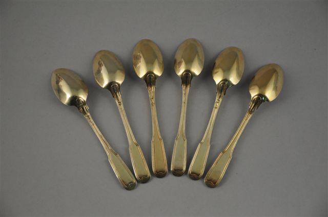 Suite de SIX CUILLÈRES à CAFÉ en vermeil, modèle à filets, poinçons non lisibles et non identifiés. Strasbourg? XVIIIème. Poids: 200 g.