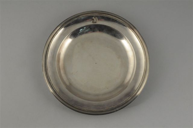 PLAT rond en argent. Bordure à filets. Monogramme en relief "I.D" sur l'aile. Poinçon Premier Coq (1798-1809). Orfèvre: ODIOT. Poids: 790 g. Diam. 27 cm.