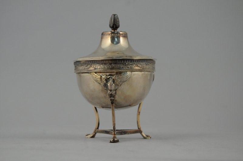 SUCRIER tripode en argent. Le corps hémisphérique reposant sur trois pieds terminés en griffes, réunis par une entrejambe. Cygne aux ailes deployées aux attaches et en bordure. Frises de rangs de perles et de feuilles d'eau. Le couvercle à profil concave, prise en bouton Poinçon Minerve.