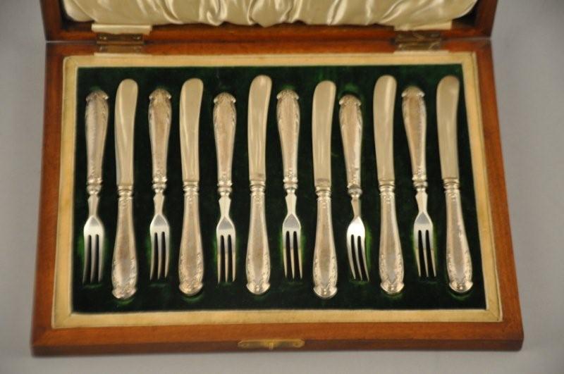 Suite de SIX COUTEAUX et de SIX FOURCHETTES à dessert, manches en argent fourré à feuillages et noeuds de ruban. Dans un coffret placage de palissandre à écusson.