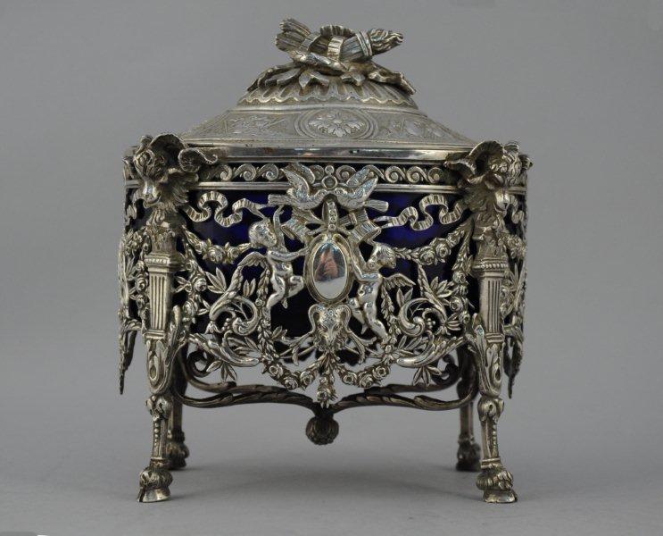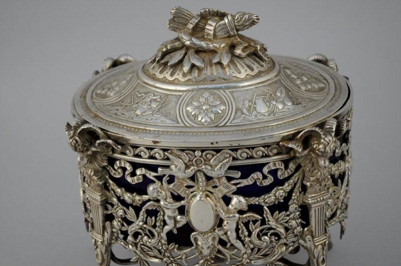 SUCRIER ovale en argent. Il repose sur quatre pieds réunis par une entrejambe de volutes feuillagées, terminés en sabots. Quatre têtes de bélier ornent les montants. Le corps présente un décor ajouré au riche répertoire ornemental Louis XVI. Sur chaque face, deux angelots soutiennent un cartouche ovale avec, au dessus, deux colombes et, en dessous, une tête de bélier. Guirlandes de fleurs, rinceaux feuillagés, noeuds de rubans et, au col, frise de flots grecs. Le couvercle à décor en repoussé d'outils de jardin dans quatre réserves alternées de rosaces. Prise du couvercle composée d'un flambeau et d'un carquois de flèches, sur cannelures rayonnantes. Poinçon Minerve. Intérieur en verre bleu.