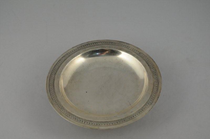 COUPE sur PIED en métal argenté, décor en frise de feuilles d'eau en bordure. Diam. 24,5 cm.