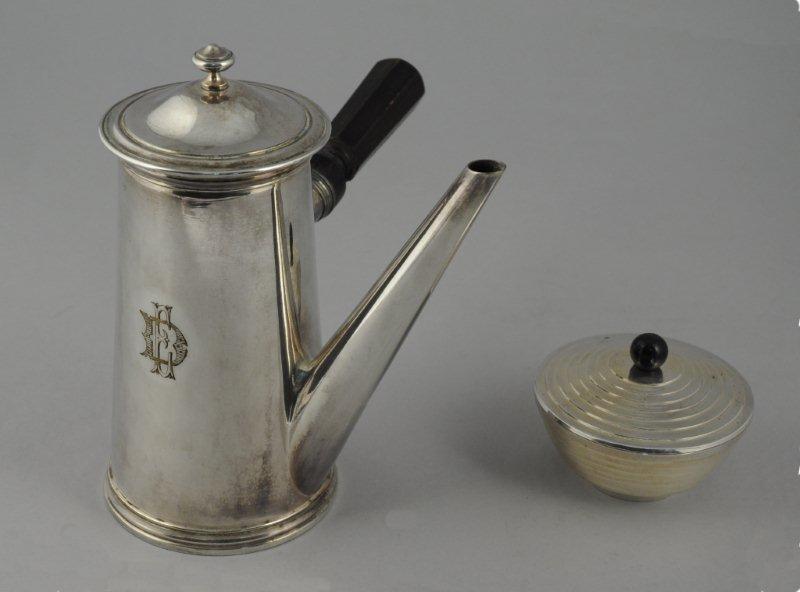 VERSEUSE tronconique à fond plat en métal argenté. La base et la bordure du couvercle à filets. Anse latérale en bois noirci à pans, prise en bouton. CHRISTOFLE. Haut. 20,5 cm.