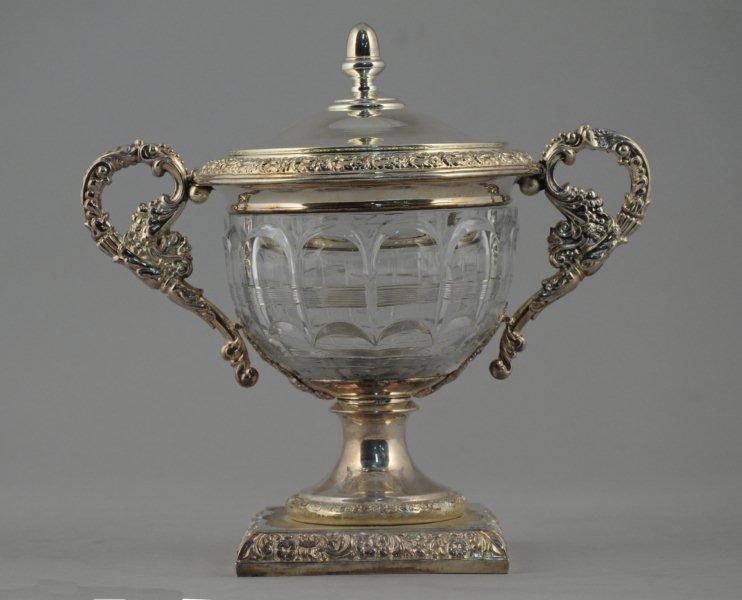 DRAGEOIR couvert en métal argenté et cristal. Base carrée, doucines à guirlandes feuillagées et fleuries. Anses de corne d'abondance, palmettes et feuilles de lotus. Réceptacle cristal taillé en arcades. Restauration, milieu XIXème. Haut. 24,5 cm.