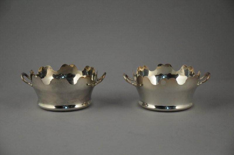 PAIRE de VERRIERES rondes en métal argenté. Anses unies. XXème.