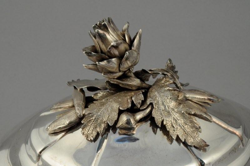 RARE SUITE de QUATRE CLOCHES à PLATS: 3 rondes, 1 ovale en métal argenté, à larges côtes et doucine. Exceptionnels frétels traités en naturel: artichaut/poissons - radis/feuilles de céleris - pivoines - et artichaut/haricots. Ecusson d'une nef à l'une avec initiales. Travail de qualité de Charles CHRISTOFLE. Milieu XIXème siècle.