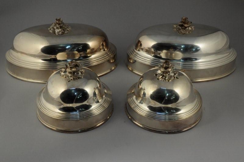 Rare SUITE DE 4 CLOCHES à PLATS: une paire ovale et une paire rondes en métal argenté. Doucine surlignée de bâtes, prise de main de fleurs champêtres épanouies.. Travail CHRISTOFLE. Fin XIXème siècle. Long. 38, Haut. 20 cm. (ovale) et Haut. 19, Diam. 25,5 cm. (ronde)