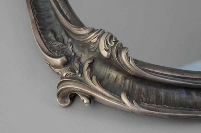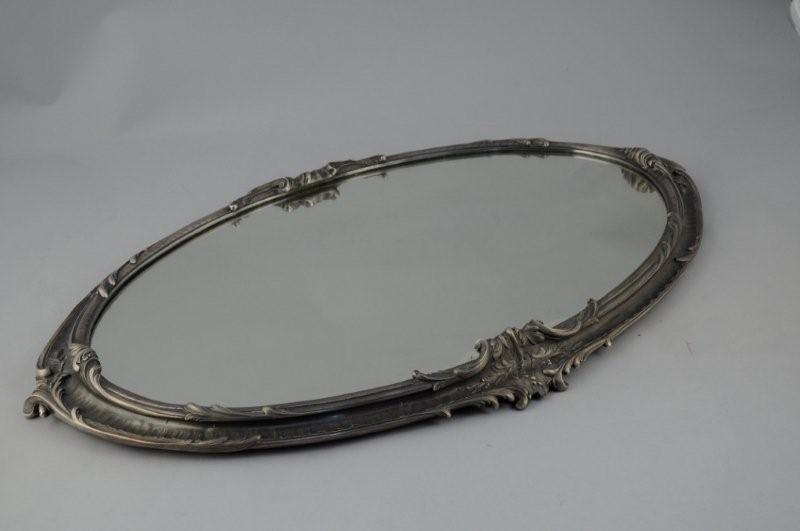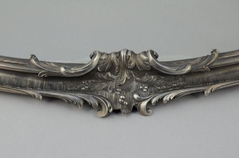 SURTOUT de table ovale en métal argenté, foncé de glace. La monture à motifs de vagues stylisées, ornée de feuilles d'acanthe et de feuillage. CHRISTOFLE.
