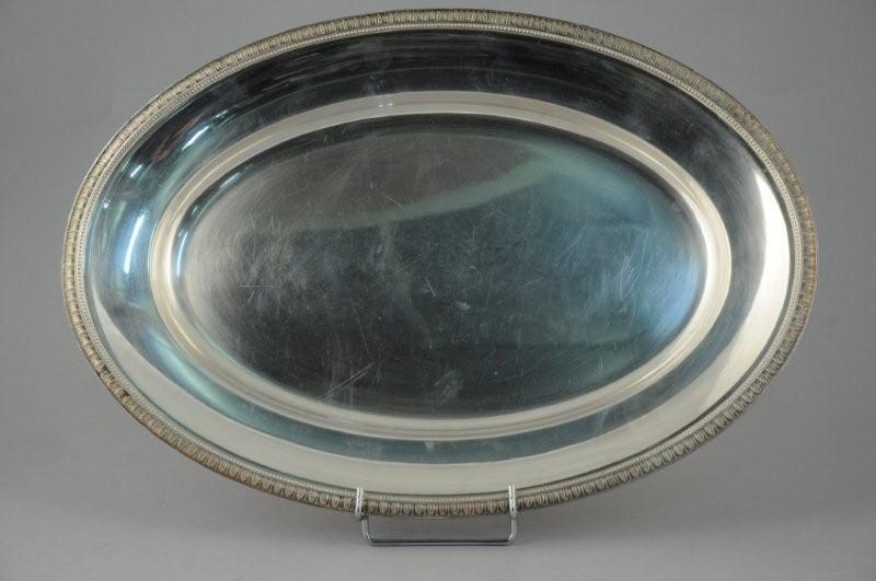 PLAT ovale en métal argenté. Bordure à rang de perles et frise de feuilles d'eau. CHRISTOFLE. Long. 45,5 cm.
