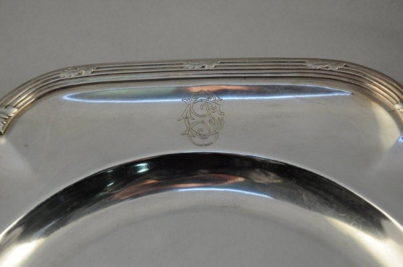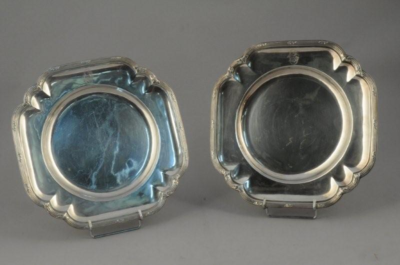 PAIRE de PLATS en métal argenté, de forme carré à pans, orné sur le pourtour de rubans feuillagés. Style XVIIIème. Initiales entrelacées C.J. Travail CHRISTOFLE. 30 x 30 cm.