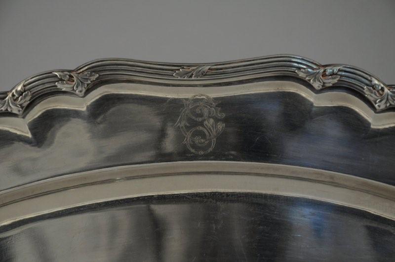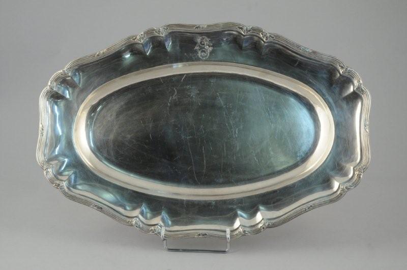 SUITE DE TROIS PLATS ovales en métal argenté de style milieu XVIIIème. Bords à doucine et guirlande feuillagée. Initiales C.J. Travail Christofle. Long. 46, Larg. 30 cm.