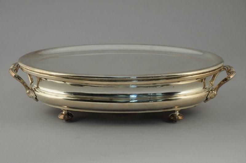 CHAUFFE-PLAT ovale en métal argenté. Il repose sur quatre pieds toupie, anses feuillagées. Travail Christofle. XIXème. Long. 45, Haut. 11, Larg. 25 cm.