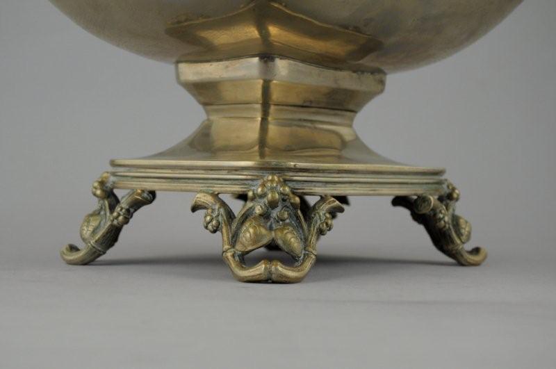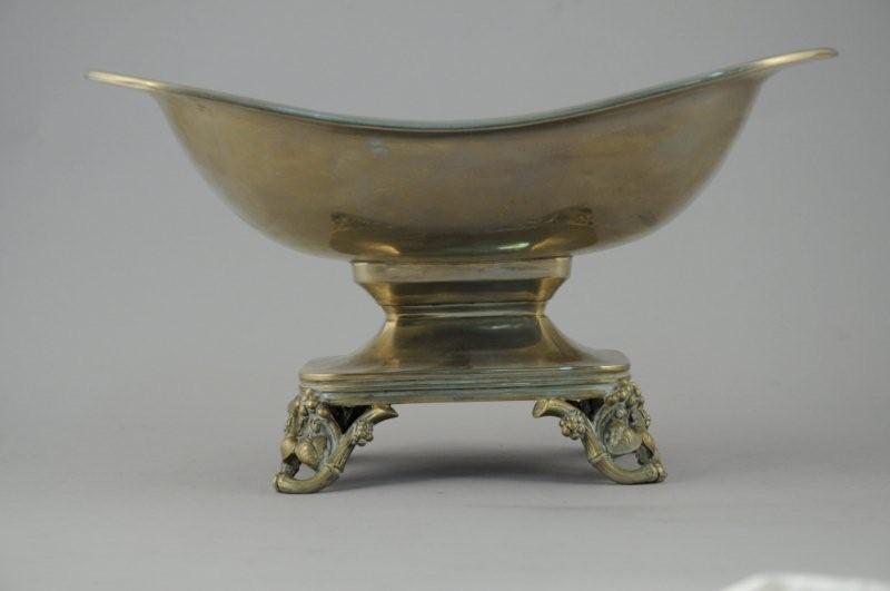 Rare BAC à SORBETS en métal argenté, en forme de réceptacle rectangulaire évasé, reposant sur un piédouche quadripode à motifs de branches feuillagées. Haut. 20, Long. 35, Larg. 29 cm (usures)