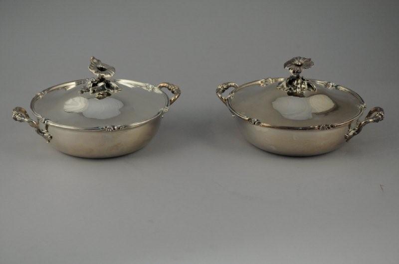 PAIRE de LEGUMIERS ronds en métal argenté. Anses latérales feuillagées, couvercle à bordure ornée de fleurs, la prise en fleur de volubilis. Marqués CHRISTOFLE. Haut. 14, Diam. 22,5 cm.
