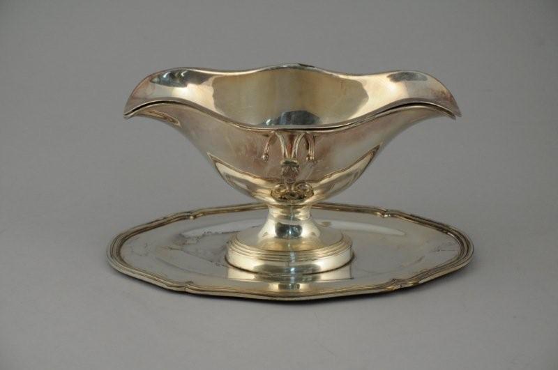SAUCIÈRE et son dormant ovale en métal argenté. Modèle à filets contours. Anses latérales à entrelacs. Doublure. CHRISTOFLE. Style Louis XV. Fin XIXème. Haut. 14, Long. 27,5 cm.