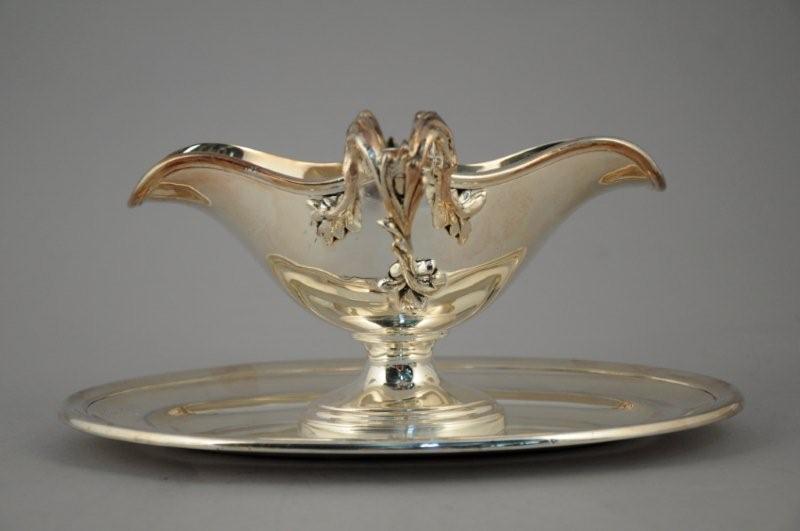 SAUCIÈRE et son dormant ovale en métal argenté uni. Bordures à profil moulurés. Anses latérales en branches feuillagées. Monogrammé "H.I.". TISSIER. Haut. 12, Long. 25,5 cm.