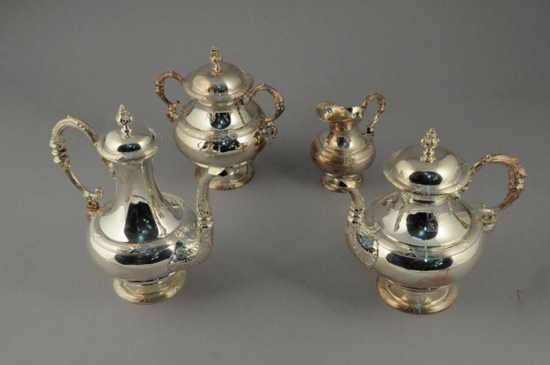 SERVICE à THÉ et CAFÉ 4 pièces en métal réargenté comprenant une cafetière, une théière, un sucrier et un pot à lait, sur pied. Décor de filets et rubans croisés, anses mouvementées, prise des couvercles en graine. Monogrammé "R.B.". BOULENGER. Style Louis XVI.