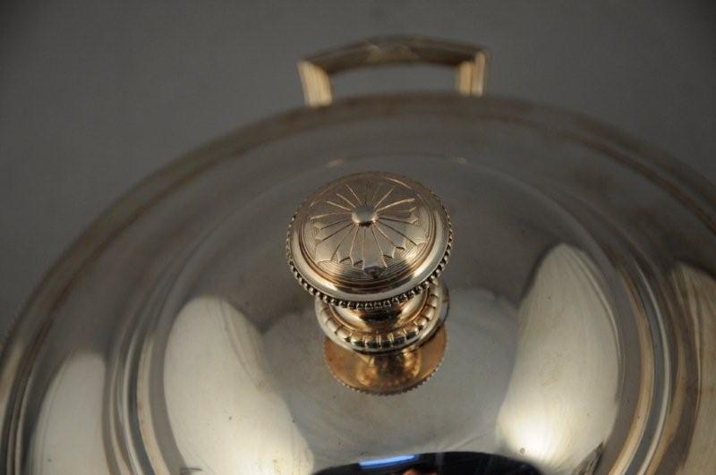 LÉGUMIER rond en métal argenté uni. Les anses Les anses à filets et rubans croisés terminées en feuilles d'acanthe. Couvercle orné d'un rang de perle en bordure, la prise ronde à motif géométrique rayonnant et rang de perles. CHRISTOFLE. Style Louis XVI. Haut. 16, Diam. 22 cm.