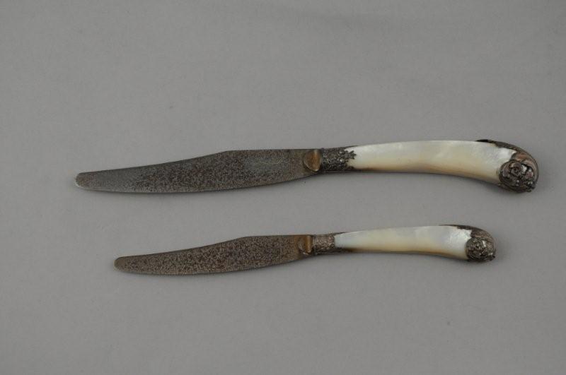 Petit et grand COUTEAUX à manches en nacre en forme de crosse, appliqués de feuilles d'acanthe et de fleurs argentées. Lames marquées CARDEILHAC. Dans un écrin de la Maison CARDEILHAC. Long. 20,5 et 25,5 cm (lames oxydées, fente et restauration à un manche)