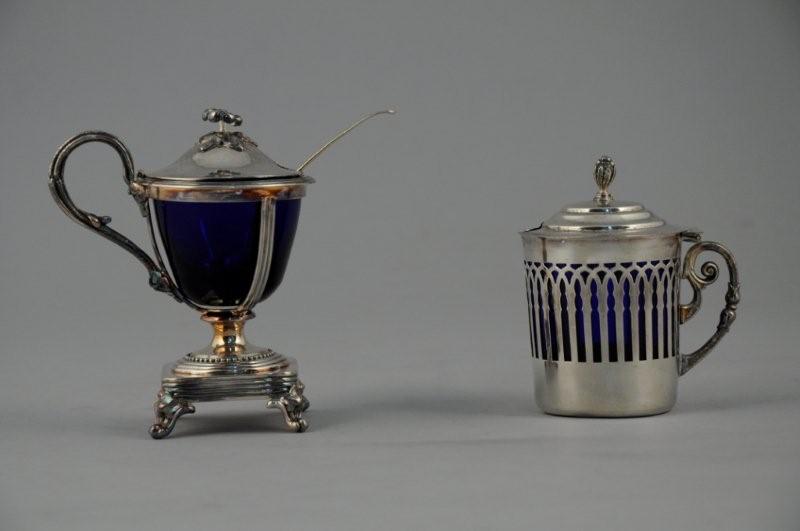 Deux MOUTARDIERS en métal argenté. Le premier quadripode à base quadrangulaire, le corps ovoïde, à bordure godronnée, couvercle à prise florale, anse mouvementée, intérieur en cristal bleu. CHRISTOFLE (Haut. 12,5 cm). Le second cylindrique à fond plat, ajouré de motifs en ogives, anse en volute, prise du couvercle en graine.( Haut. 9,5 cm). Joint: cuillère à moutarde en métal argenté.