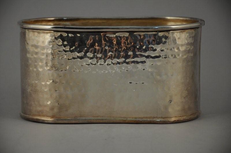 JARDINIÈRE en métal argenté de forme oblongue, à effet martelé. Haut.10, Long. 20,5, Larg. 11 cm.