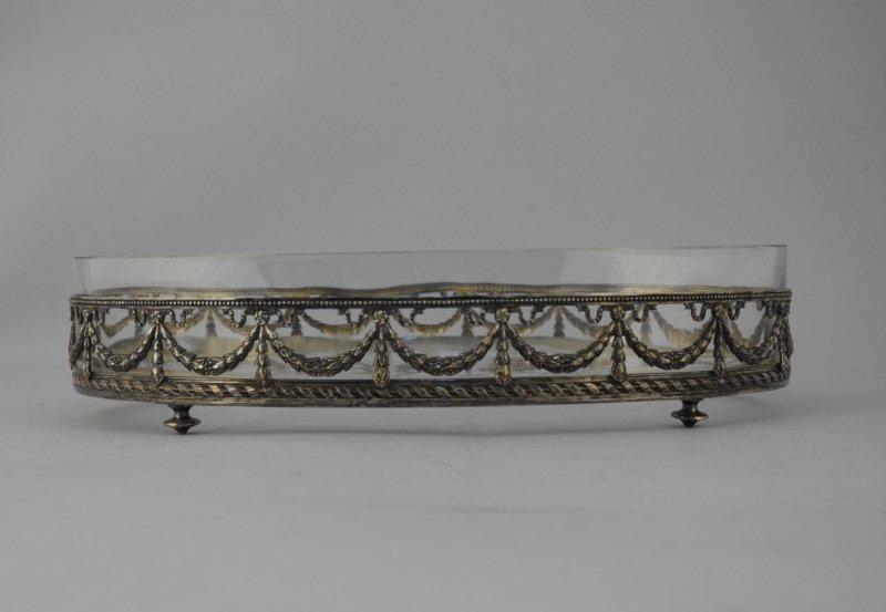 JARDINIÈRE ou COUPE OVALE en verre, la monture en métal argenté reposant sur quatre pieds toupie, ajourée de guirlandes de laurier nouées de rubans.